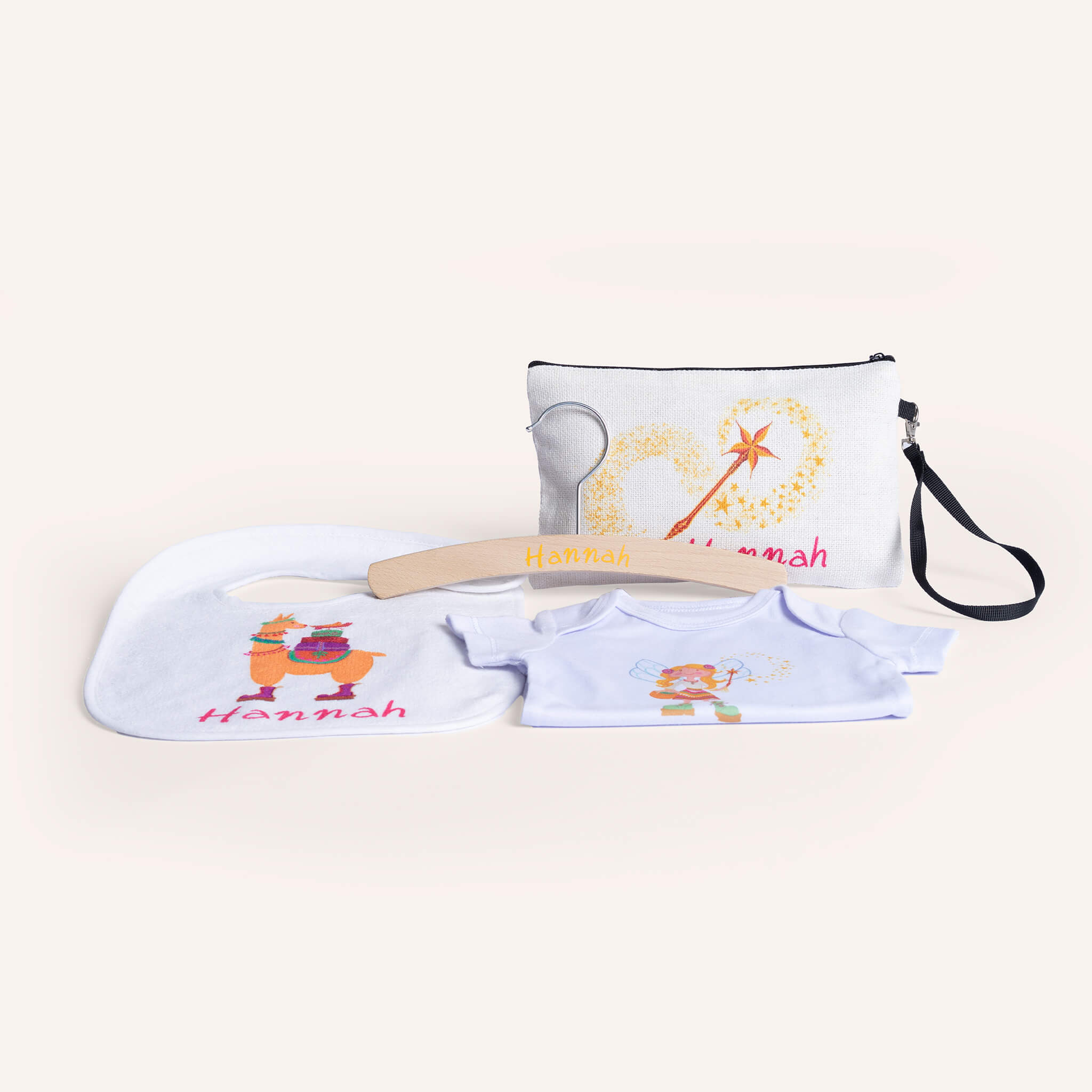 In dit cadeaupakket vind je vier unieke items. De romper, het slabbetje, het opbergtasje en de houten kledinghanger zijn allemaal gepersonaliseerd en versierd met elementen uit het elfenrijk. Een compact, stijlvol en betekenisvol kraamcadeau dat direct een glimlach op het gezicht tovert.
