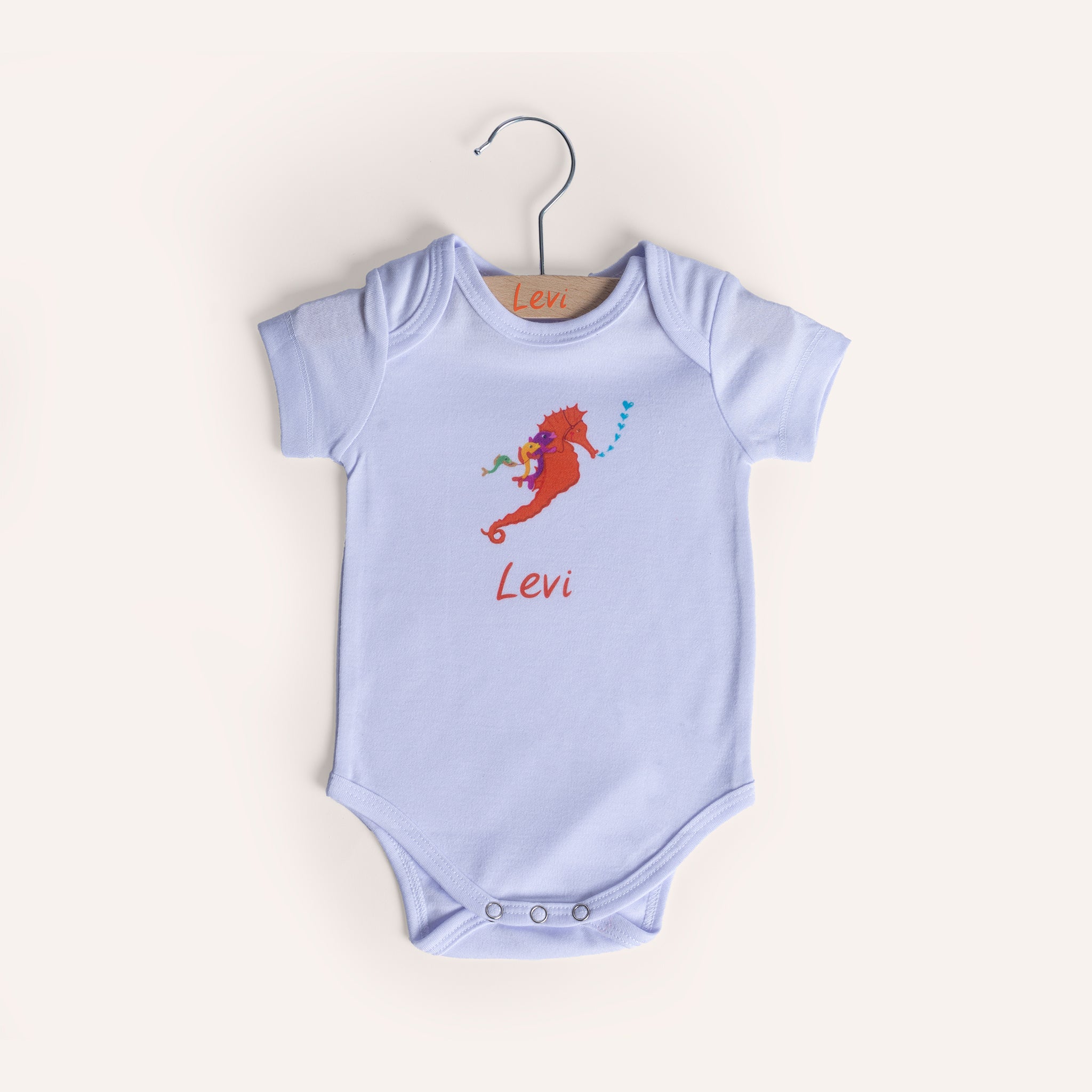 Op deze zachte romper zie je een vrolijke afbeelding van een zeepaardje dat samen met nieuwsgierige visjes door het water zweeft. Perfect voor knuffels, dutjes en ontdekkingstochten.
